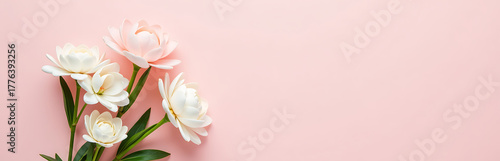 © fotoluigi868, Fototapeta premium delicate bouquet white flowers rests soft creamy pastel pink backdrop serene overhead flat lay