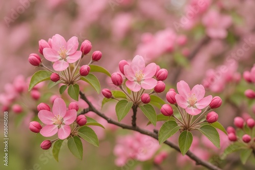 © AkuAku, Obraz premium Delicate branches of a flowering fruit tree adorned with pink ornamental blossoms
