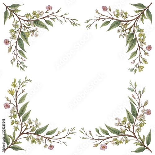 © Janya, Naklejka premium Delicate branches with small flowers and leaves, flowing from the corners of a transparent background — perfect for framing content.