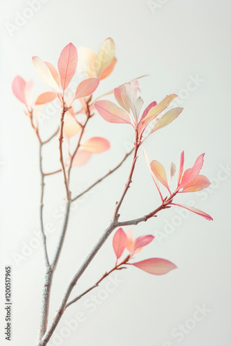 Fototapeta premium Delicate branches with soft pastel leaves against a light, neutral background...