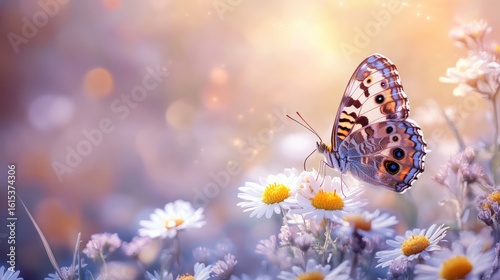 Obraz premium Delicate butterfly on wildflowers, soft pastel colors, bokeh