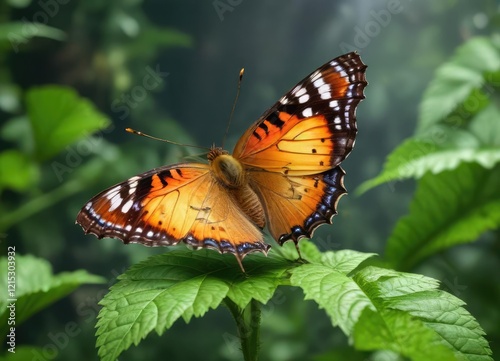 © Chanchai, Obraz premium Delicate butterfly perched on a lush green nettle leaf, foliage, nature, wildlife