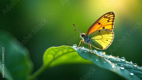 © Galeno, Obraz premium delicate butterfly perches leaf intricate antennae glowing microscopic droplets refract light tiny