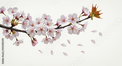 © islam bepari, Fototapeta premium Delicate cherry blossom branch with falling petals isolated on a clean white background