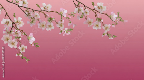 Obraz premium Delicate cherry blossom branches adorned with soft pink flowers create serene and tranquil atmosphere against gradient pink background. This evokes feelings of beauty and renewal