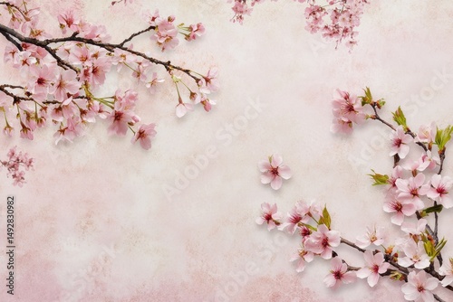 Fototapeta premium Delicate cherry blossom branches create a serene pink background, Cherry blossom branches overlaying a delicate pink Japanese pattern, framed in oriental style