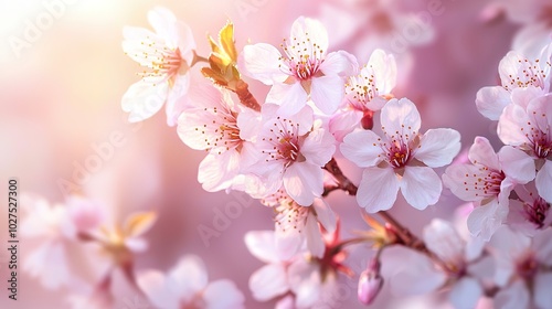 Obraz premium Delicate cherry blossom flowers in soft pink hues, illuminated by gentle sunlight, creating a serene and enchanting spring atmosphere.