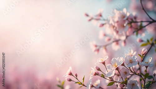 Fototapeta premium Delicate cherry blossoms blooming against soft pastel background
