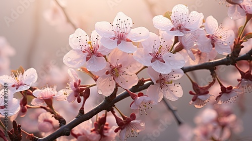 © Budi, Fototapeta premium Delicate cherry blossoms in morning dew
