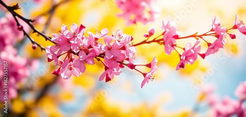 Obraz premium Delicate cherry blossoms in vibrant pink, against a sunny yellow backdrop,...