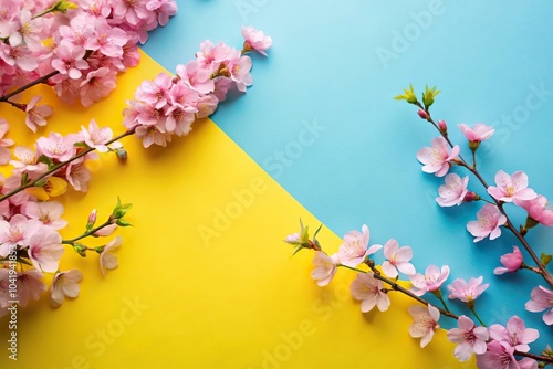 © Sayfar, Fototapeta premium Delicate cherry blossoms on blue and yellow background aerial view