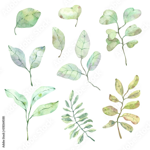 Obraz premium Delicate clipart with watercolor leaves and branches of various colors for...