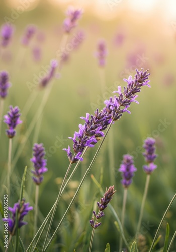Fototapeta premium Delicate clusters of lavender and violet wildflowers gently swaying in a...
