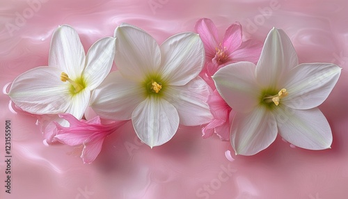 © Ilja, Fototapeta premium Delicate Composition White Rain Lily And Pink Hyacinth Blossoms On A Pastel Pink Background