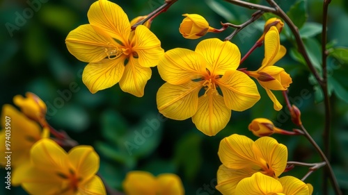© Sandra, Fototapeta premium Delicate, curved petals of vibrant yellow flowers with a golden center, suspended from slender stems, amidst lush green