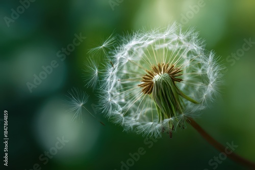 © Alona, Fototapeta premium Delicate dandelion puff with airborne seeds moving through sunlit air