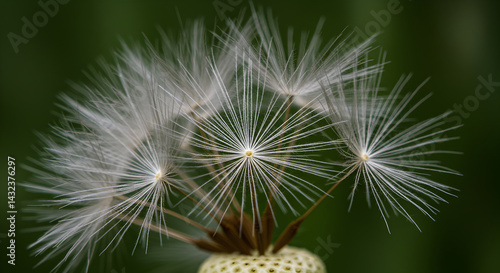 © RAJA, Fototapeta premium Delicate Dandelion Seed Head Featuring Radial Symmetry Against Muted Green Backdrop