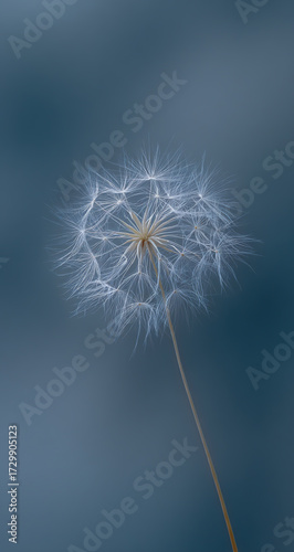 © TANZILA, Fototapeta premium Delicate dandelion seed head with ethereal wisps against a soft blue blurred background