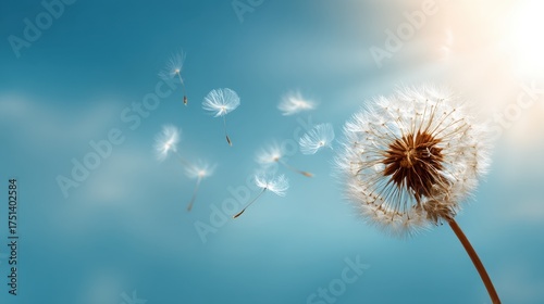 Fototapeta premium Delicate Dandelion Seeds Floating in a Clear Blue Sky at Sunset, Nature's...