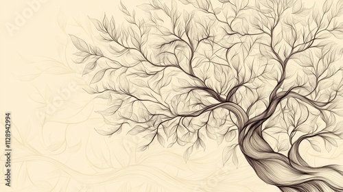 Fototapeta premium Delicate doodle line art of a tree, with flowing branches and detailed leaves, set against a soft, neutral background for a peaceful look