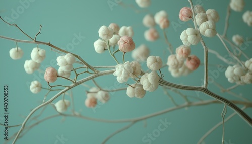 © GOLVR, Fototapeta premium Delicate Dried Plant Twigs White Pink Buds Abstract Teal Background