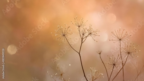 © Anastasiia, Fototapeta premium Delicate dried wildflower umbels on slender stems, tiny seeds at the tips, glowing in warm golden light. Concept Delicate Wildflowers, Golden Hour Glow, Dried Botanicals, Ethereal Still Life