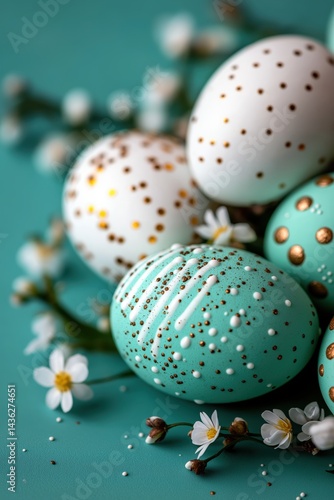Fototapeta premium Delicate Easter eggs adorned with intricate decorations on a pastel green...