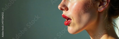 Obraz premium Delicate female face in profile with open mouth and lips revealing a slice of...