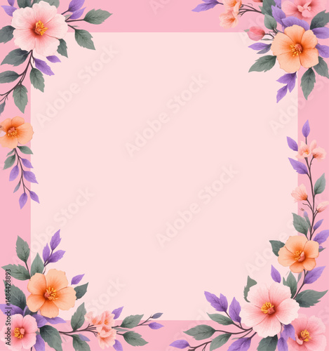 © TTh, Obraz premium Delicate Floral Border on Soft Pink Background with Hibiscuses and Leaves