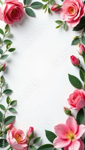 Fototapeta premium Delicate floral frame with roses, lilies, and eucalyptus, botanicals, frames, natural elements