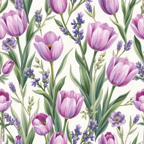 © cinta, Fototapeta premium Delicate Floral Pattern with Tulips and Lavender on Soft Background