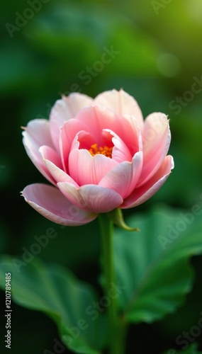 © Pusit, Fototapeta premium Delicate flower bloom unfurls petals fully open, greenery, closeup