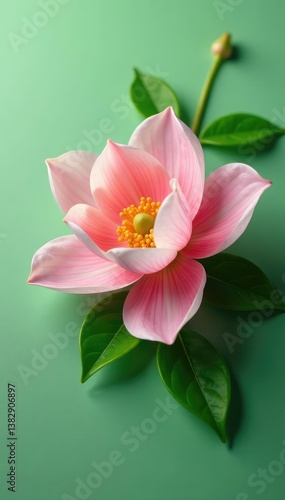 © Thanwara, Fototapeta premium Delicate flower petals unfolding on a plain surface, leafy greens, plant, green