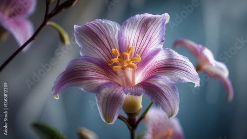 Fototapeta premium Delicate flower with purple and white petals, orange center, bokeh background
