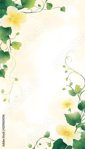 Fototapeta premium Delicate flowers and green leaves frame the light yellow background