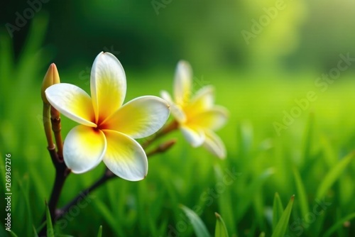 Fototapeta premium Delicate frangipani petals bloom in the lush green grass, tropical, nature