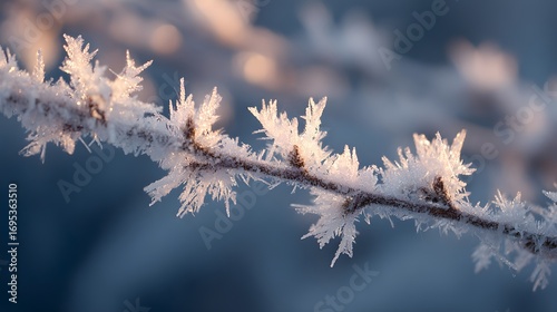 © kirania, Obraz premium Delicate frost crystals adorn a branch against a soft, wintery backdrop.
