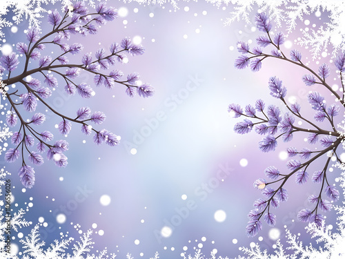 © Wuttichai, Obraz premium Delicate frosty branches with lavender blossoms in a soft winter background, digital illustration of nature concept.