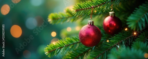 © สิริวุฒิ นาคโคตร, Obraz premium Delicate glass ornaments refract light on lush green branches, glittering, tree