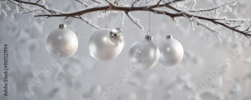 © Phennapha, Fototapeta premium Delicate glass ornaments suspended from a frosted white branch, vases, frosty