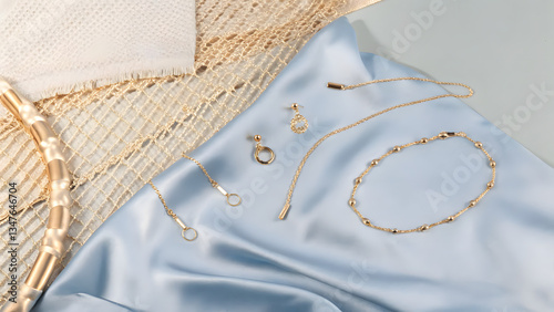 © ThomasStockArt, Fototapeta premium Delicate gold jewelry a smooth satin fabric re