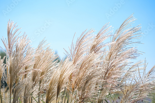 Fototapeta premium Delicate grass sways gently in the warm sunlight against a clear blue sky in...