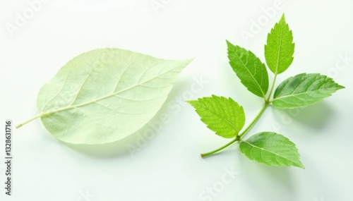 © ຈໍາປາ ຈໍາປາ, Fototapeta premium Delicate green leaf isolated on white background with subtle texture, foliage, leaves, simplicity