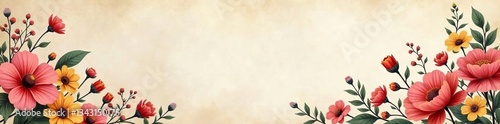 © Pimchada, Naklejka premium Delicate hand-drawn flowers forming border on vintage paper backdrop, blooming, romantic
