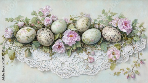 Obraz premium Delicate hand-painted Easter eggs surrounded by pink flowers on a lace...