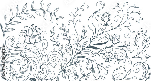 Fototapeta premium Delicate HandDrawn Floral Ornaments with Curled Vines, Leaves, and Buds...