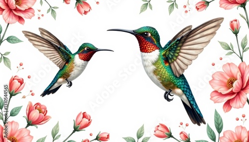 © อัญชลี โคตรธรรม, Obraz premium Delicate hummingbird illustration in a seamless repeating floral pattern on white background, floral patterns, repeating patterns