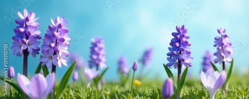 Naklejka premium Delicate hyacinths and crocuses against a tranquil blue, white, closeup, color