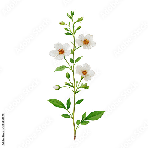 © Prichachai, Obraz premium Delicate illustration of white flower with green leaves on stem, showcasing nature simplicity and beauty. floral design is detailed and elegant, perfect for botanical themes