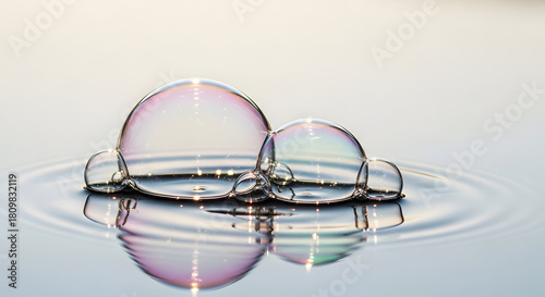 Obraz premium Delicate iridescent soap bubbles floating serenely on calm water with soft,...